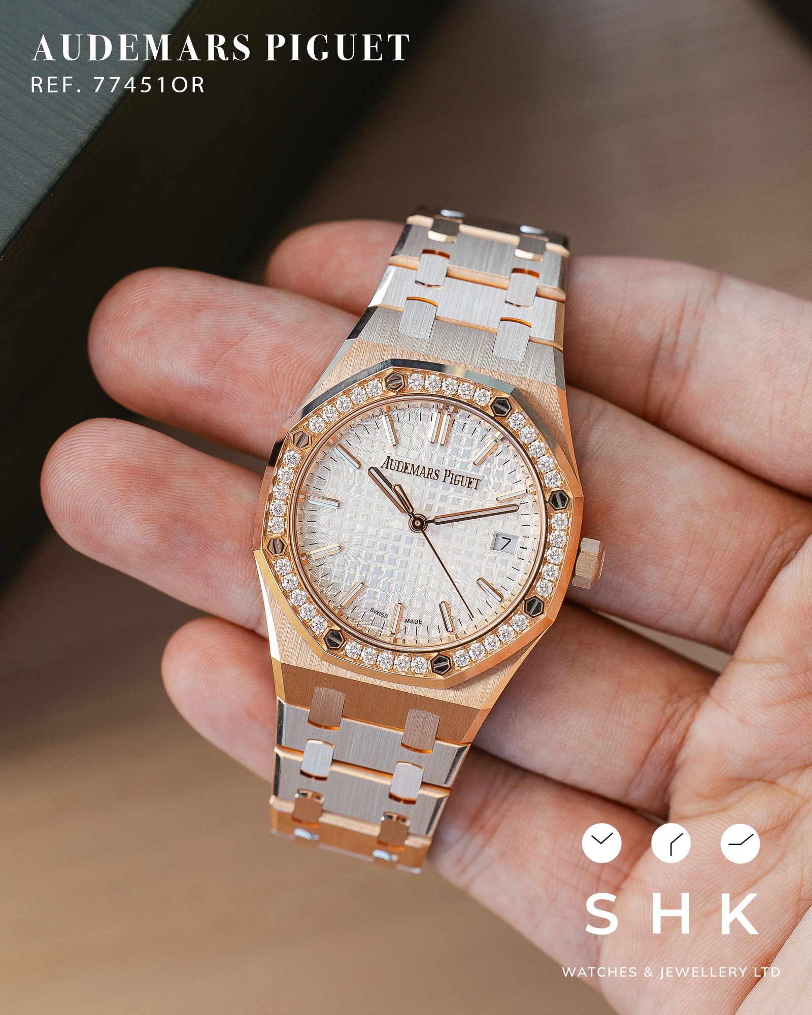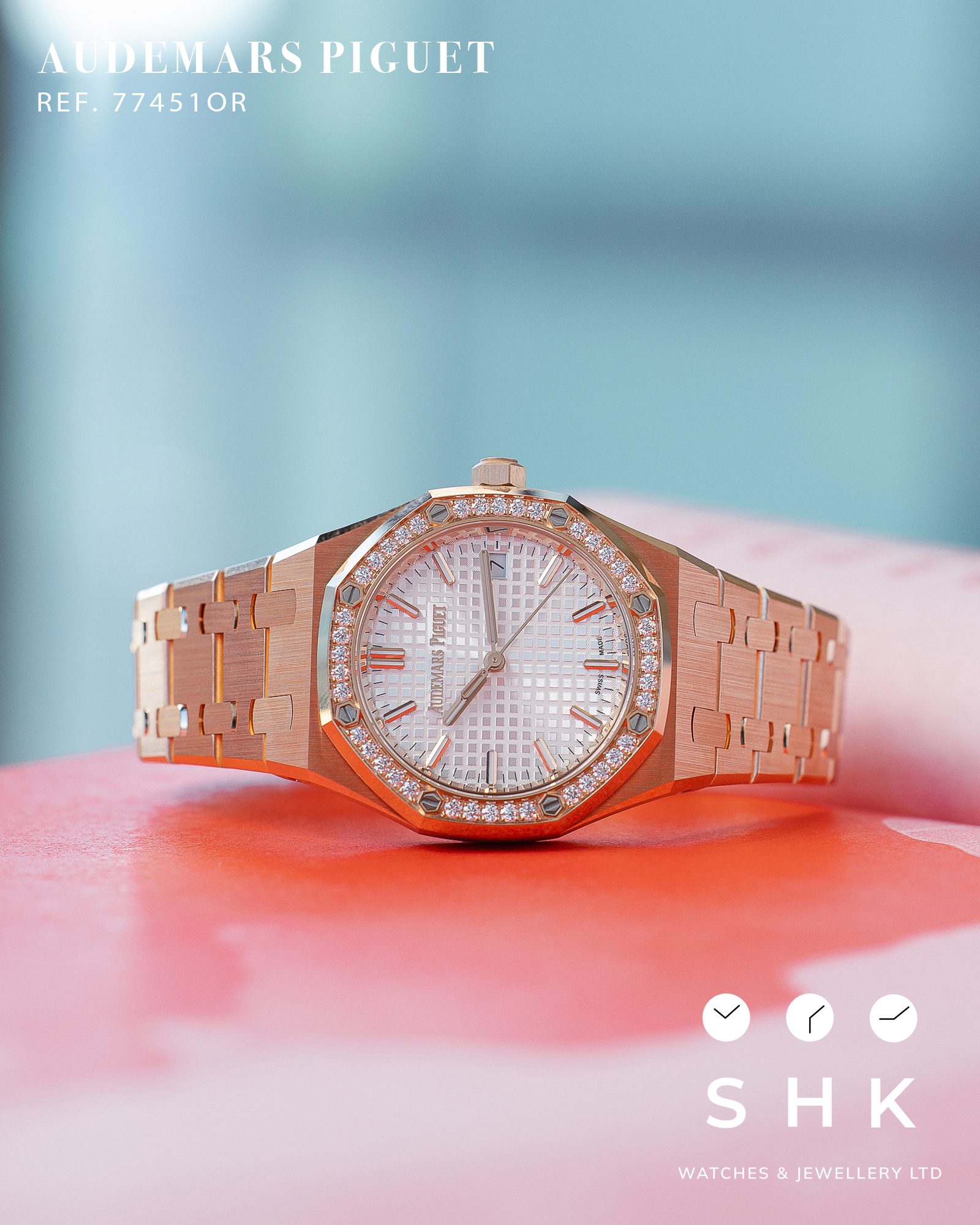 The Audemars Piguet Royal Oak 77451OR “Ladies” in 18k Rose Gold with Silver Dial and Diamond Bezel is a radiant expression of elegance and iconic design. Crafted in luxurious 18k rose gold and enhanced by a brilliant diamond-set bezel, this refined 34mm timepiece beautifully balances sporty architecture with feminine sophistication. The luminous silver dial adds timeless versatility, making the 77451OR a graceful yet powerful statement within the legendary Royal Oak collection. At SHK Watch, we proudly guarantee 100% authentic luxury timepieces, ensuring complete confidence with every purchase.