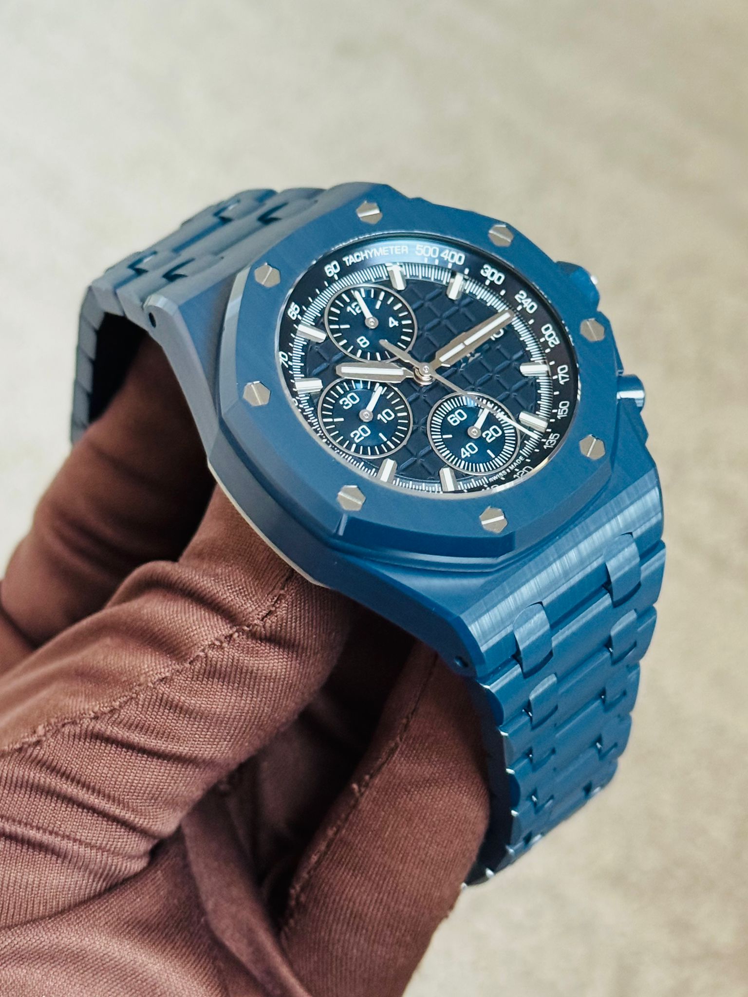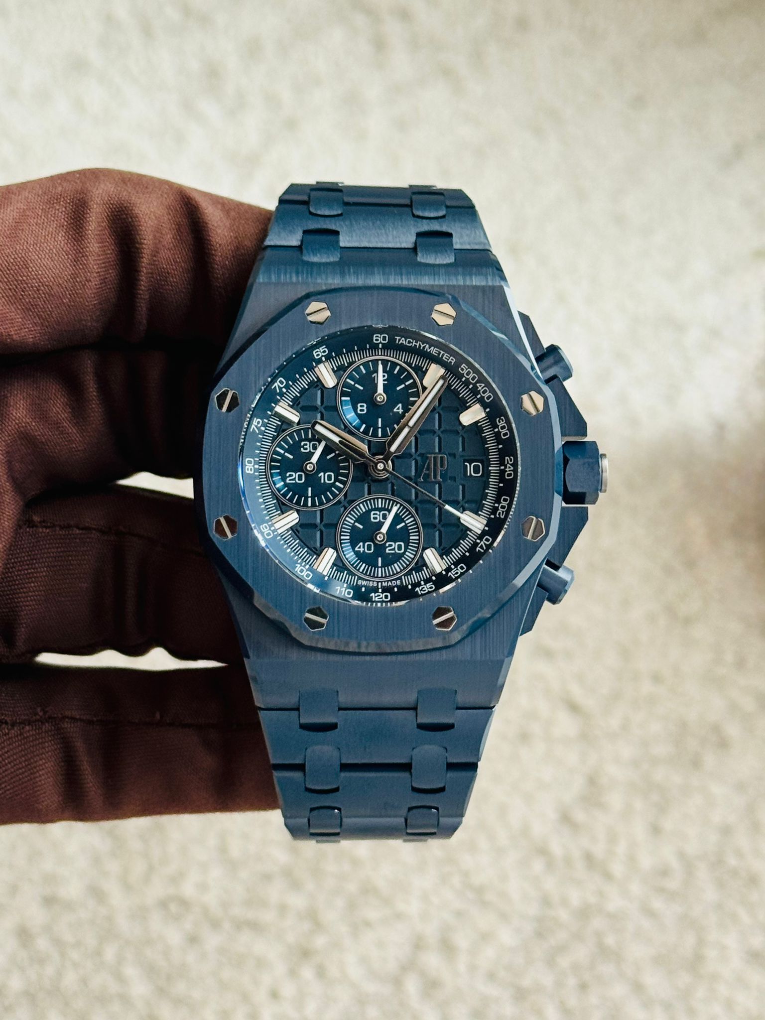 Experience the bold elegance of the Audemars Piguet Royal Oak Offshore 26238CD.OO.1300CD.01 in full Blue Ceramic. This 42mm masterpiece features AP’s in-house Calibre 4404 automatic flyback chronograph, iconic Méga Tapisserie dial, sapphire caseback, and integrated ceramic bracelet. A rare luxury timepiece crafted for true collectors who appreciate exclusivity, innovation, and Swiss watchmaking excellence.