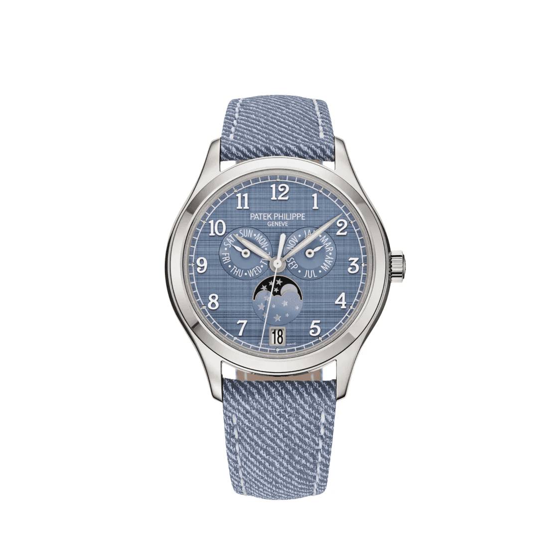 The 38mm 18K white gold case is fully polished and paired with a sapphire crystal case back, allowing a clear view of the finely finished movement. The dial’s dual vertical and horizontal satin-brushed finish evokes the texture of raw silk, enhancing depth and visual interest, while applied Arabic numerals and luminous hands ensure excellent legibility. Completed with a blue-gray calfskin strap featuring a denim-style pattern and contrasting stitching, this timepiece offers a perfect balance of casual sophistication and haute horlogerie excellence.