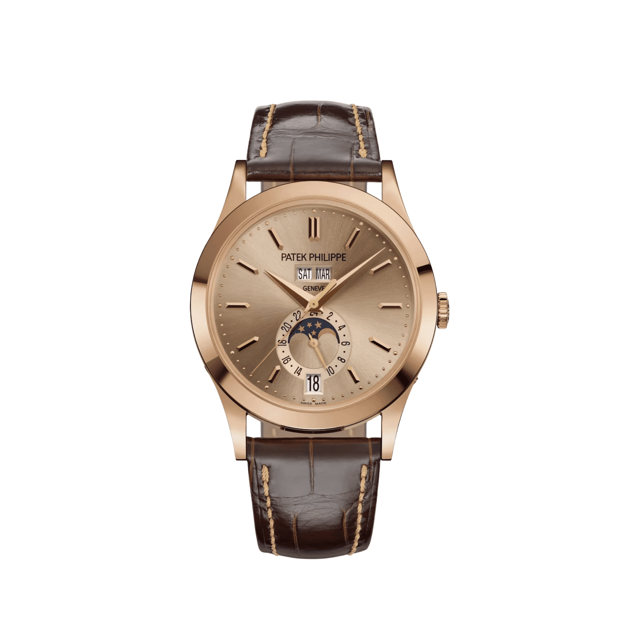 The 38.5mm 18K rose gold case is fully polished, inspired by classic Calatrava proportions, and fitted with discreet corrector pushers along the caseband for calendar adjustments. The sunburst sand beige dial is complemented by applied rose gold hour markers and dauphine hands, offering exceptional legibility with understated luxury. Paired with a dark chestnut alligator leather strap and a matching rose gold folding clasp, this timepiece embodies everyday practicality with haute horlogerie refinement.