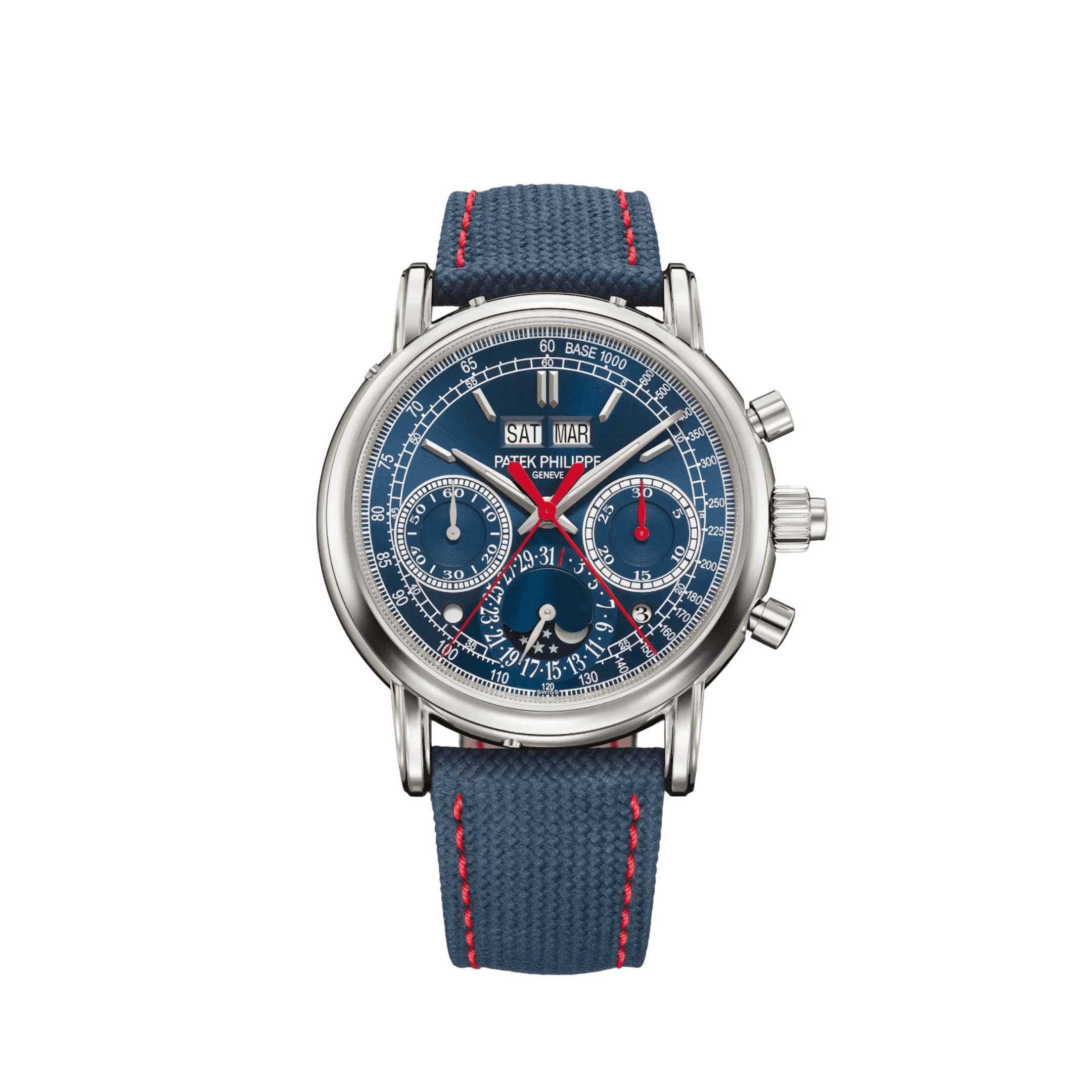 The Patek Philippe Grand Complications 5204G-010 Split-Seconds Chronograph Perpetual Calendar is a pinnacle of mechanical excellence, combining one of watchmaking’s most prestigious complications with contemporary aesthetics. Crafted in white gold, this exceptional 2026 release features a striking navy blue sunburst dial with contrasting red chronograph accents, offering a bold yet refined interpretation of a legendary reference.