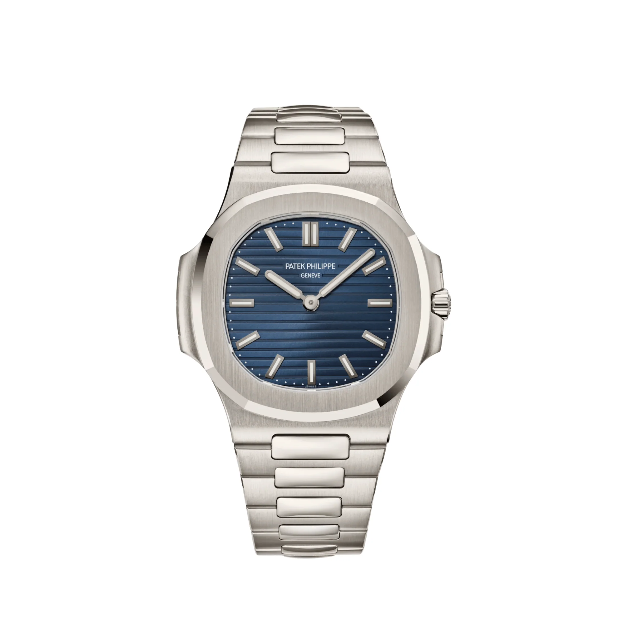 The dial embraces purity with a time-only display (hours and minutes), allowing the iconic blue sunburst finish and horizontal embossing to take center stage. White gold applied hour markers and luminescent hands ensure clarity while maintaining a clean aesthetic.A discreet diamond set at 9 o’clock subtly signifies its platinum construction, a hallmark of Patek Philippe’s most precious models.