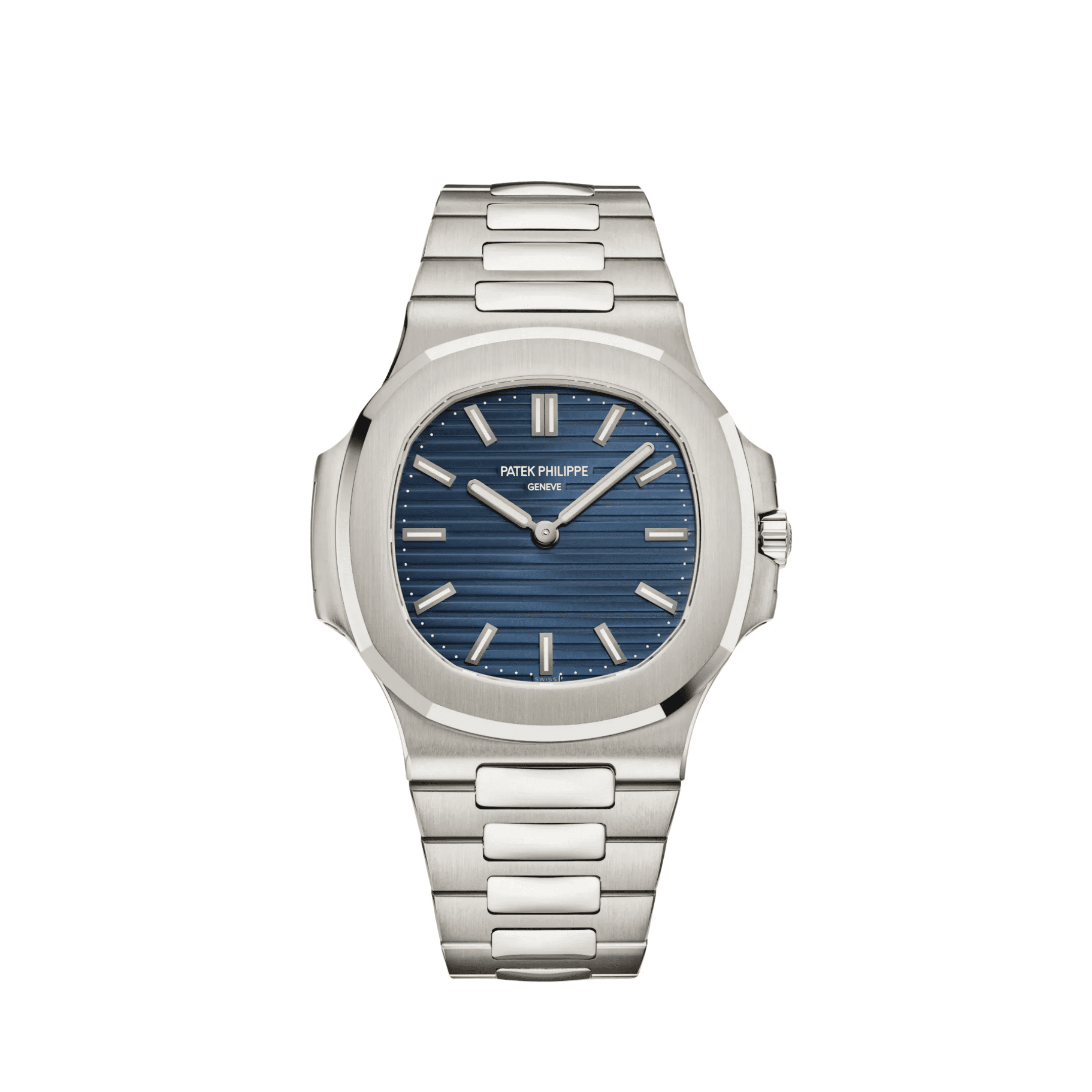 The 41mm white gold case maintains the iconic porthole-inspired design with alternating satin-brushed and polished finishes, while its slim 6.9mm profile ensures exceptional wearability. The dial is deliberately minimalist—displaying only hours and minutes—allowing the deep blue sunburst texture and applied white gold markers to take center stage, echoing the purity of the original Nautilus 3700.