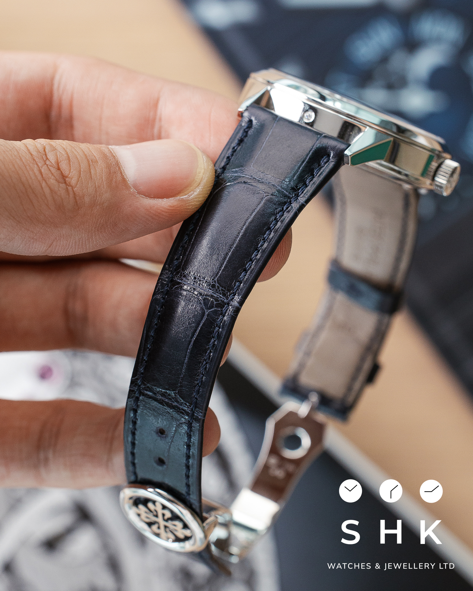 | Bracelet material | Alligator leather, matte navy blue. Fold-over clasp. |