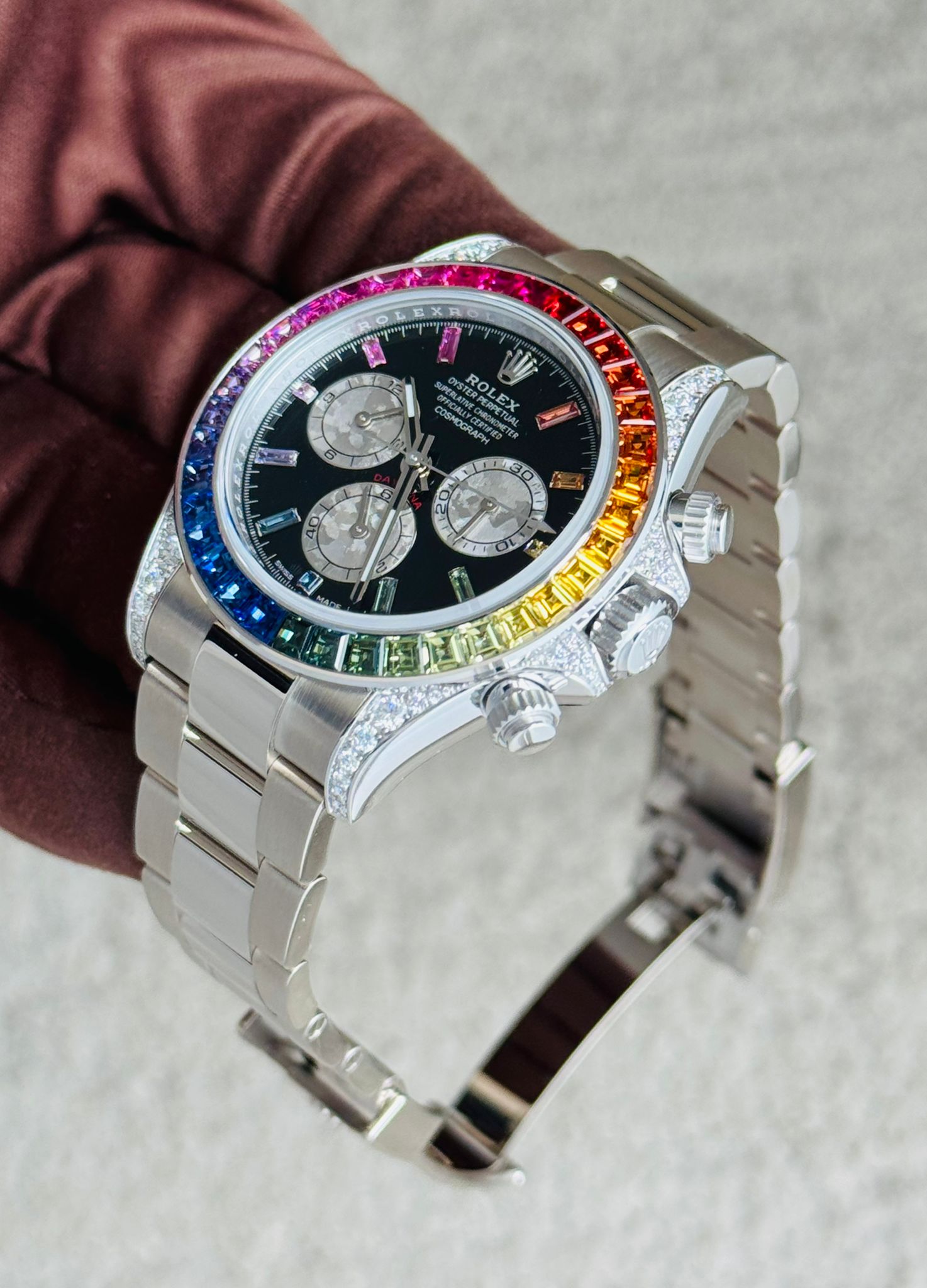 The dial further enhances the watch’s luxurious appeal with diamond hour markers and contrasting chronograph subdials, maintaining the Daytona’s signature layout for precise timekeeping and measurement. The combination of precious materials and vibrant gemstones creates a striking balance between elegance and bold individuality.