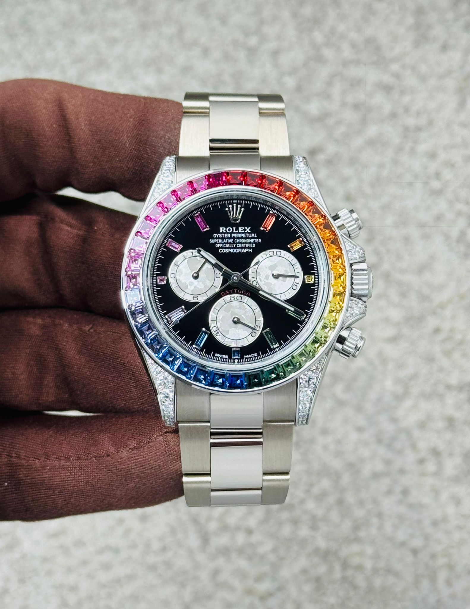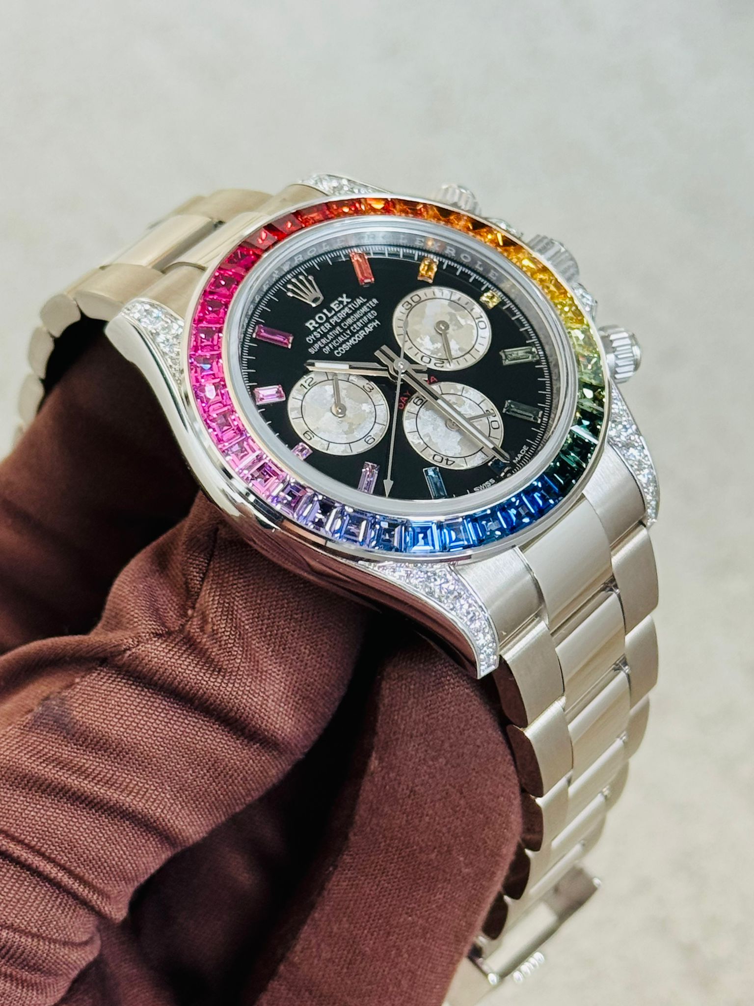 The Rolex Daytona 126599RBOW in 18k White Gold is an extraordinary and vibrant expression of one of the world’s most iconic chronographs. Known as the “Rainbow Daytona,” this exceptional 40mm timepiece is distinguished by its dazzling bezel set with a gradient of multicolored sapphires, complemented by diamond hour markers and a luxurious white gold case. Bold, rare, and unmistakably prestigious, the 126599RBOW combines high-performance chronograph functionality with exceptional gem-setting artistry. At SHK Watch, we proudly guarantee 100% authentic luxury timepieces, ensuring complete confidence with every purchase.